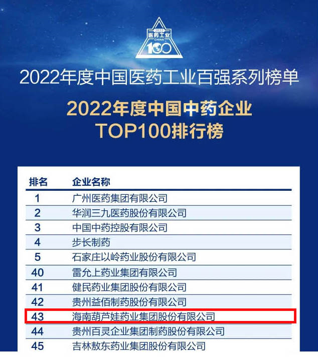 会议期间,一年一度的中国医药工业百强系列榜单隆重揭晓,NG28药业集团凭借领先的研发优势和扎实的生产实力以及稳健的市场推广能力,连续第四年成功入选“2022年度中国中药企业TOP100排行榜” ,排名稳步上升至第43位。